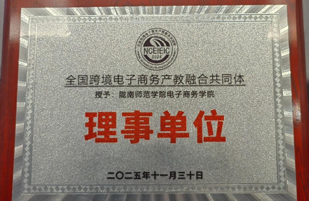 2025年12月1日,在兰州博文科技学院举办的“2025全国电子商务数字教育高质量发展研讨会暨全国跨境电子商务产教融合共同体年会”上,陇南师范学院电子商务学院被正式授予“全国跨境电子商务产教融合共同体理事单位”。我院电商学院副院长贺军忠和电子商务教研室主任王丽君代表学院接受授牌。